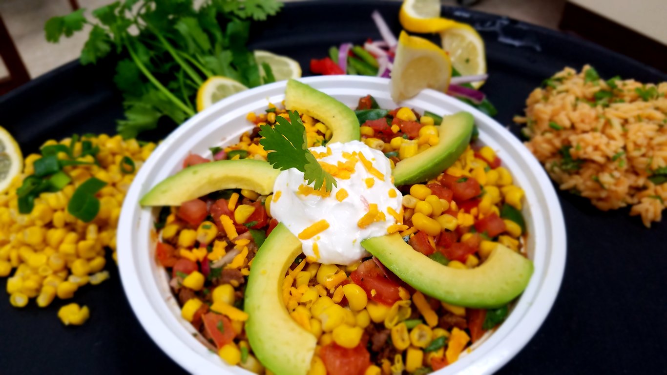 Consists of: Lemon-Lime Cilantro Rice, Black Beans & Fajitas w/ Sour Cream & Fresh Sliced Avocado w/ Our Homemade Pico de Galo & Topped w/ Our Mexican CHORIZO & Our Marinated Caribbean Rum SHRIMP